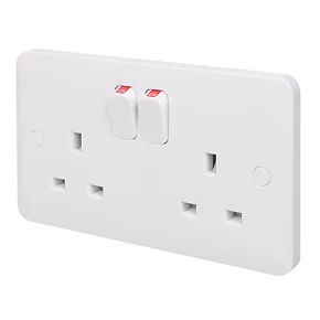 Double pole moulded plug socket. Durable, high quality urea construction with antimicrobial properties. Supplied with four screw cap covers for a sleek finish. Ideal for new construction and refurbishment projects.