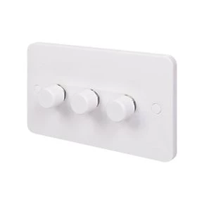 Combined mains and low voltage dimmer switch. Smooth, soft-curved plate profile. Push on/off with rotary dimming. Supplied with screw cap covers for a sleek finish.
