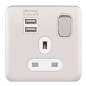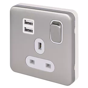 Modern switched socket with 2 USB ports, ideal for new construction and refurbishment projects. Removable screwless cover and reliable clip-in system makes painting and decorating easy. Angled and in-line terminals with backed-out and captive screws.