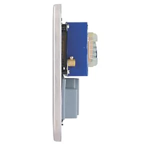 Large raised rounded-edge profile with a brushed stainless steel finish. Screwless faceplate with reliable clip-in system. Supplied with light grey back moulding for easier terminal identification. Ideally suited for new construction and refurbishment projects. Easy to install. Concealed fixings.