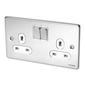 Schneider Electric Lisse Deco 13A 2-Gang DP Switched Plug Socket Polished Chrome with White Inserts