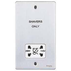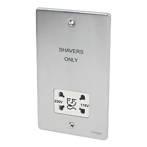 Be the first to review “Schneider Electric Ultimate Low Profile 2-Gang Dual Voltage Shaver Socket 115 / 230V Brushed Chrome with White Inserts” Cancel reply
