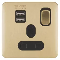 Schneider Electric Lisse Deco 13A 1-Gang SP Switched Plug Socket Satin Brass with Black Inserts